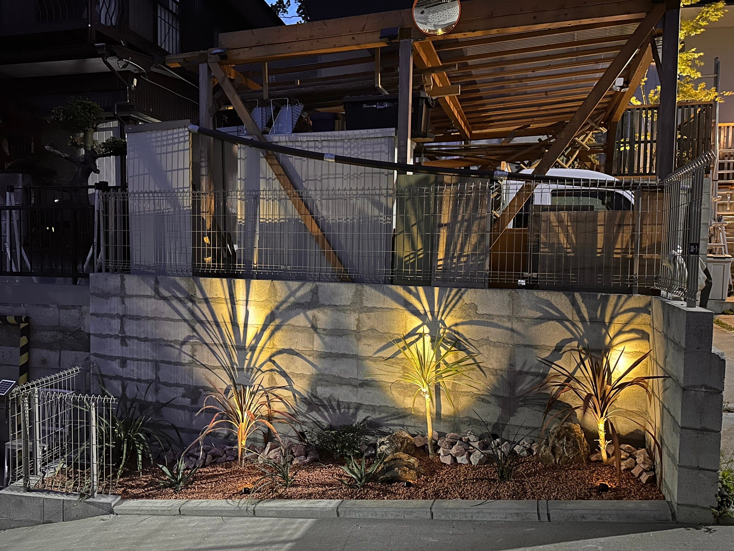 これで作業は終わりです。。。と、思ったのですが夜もオシャレに演出出来そう!と思いライトアップしてみました。近くにライトの為の電源が確保出来なかったのでソーラーパネルで使える機材を選びました。小型なのに結構明るく照らしてくれて、日中太陽に当たっていれば夕方から朝方まで点灯してくれるという中々いい物です。